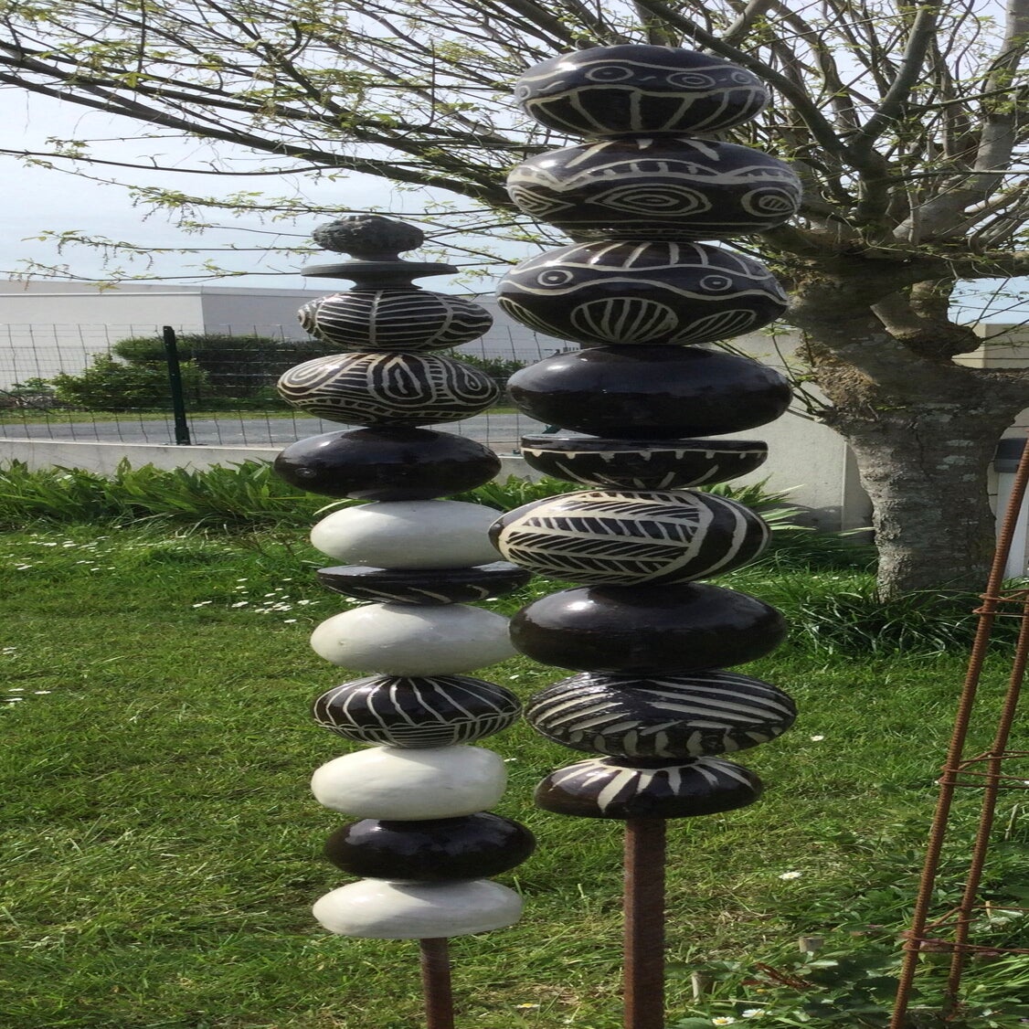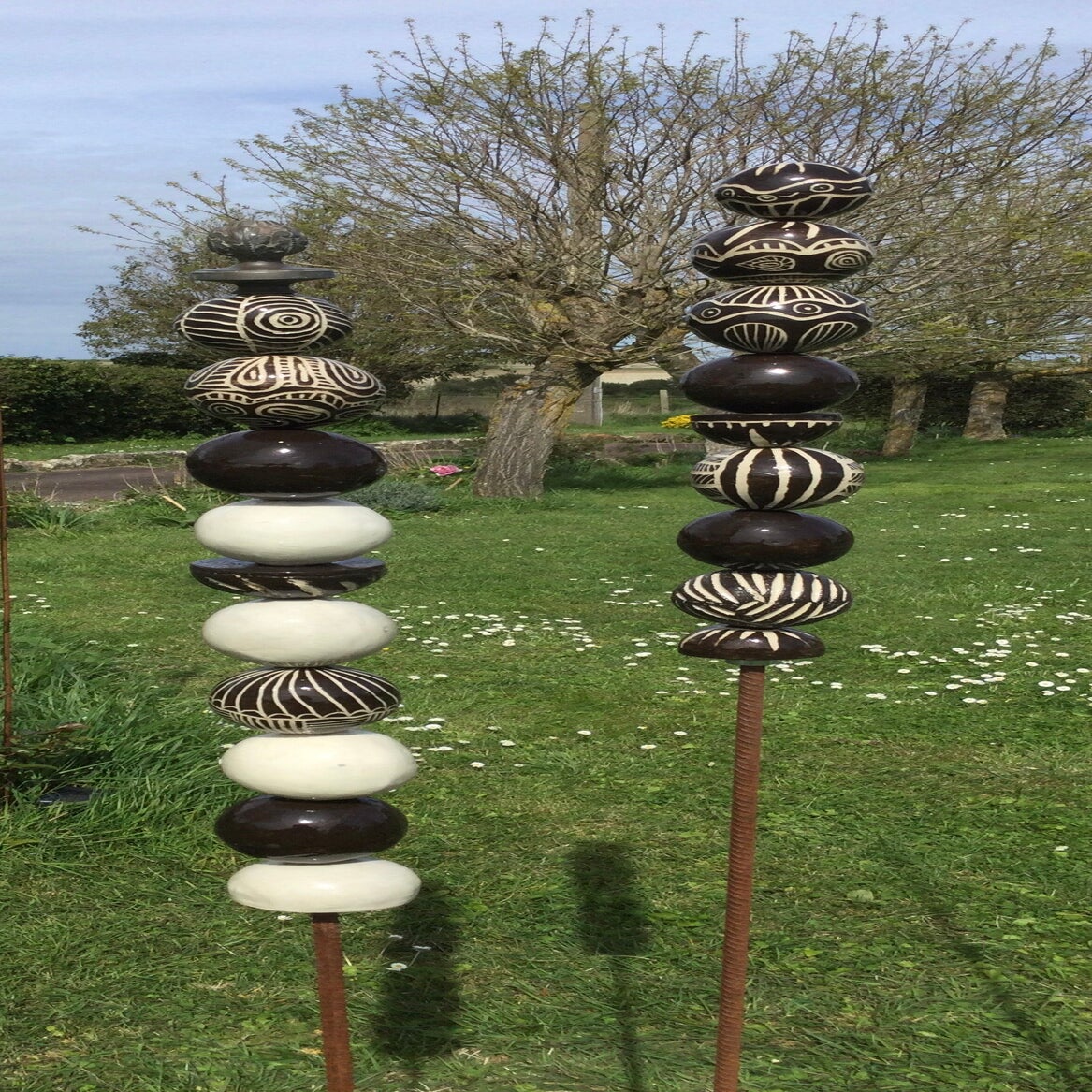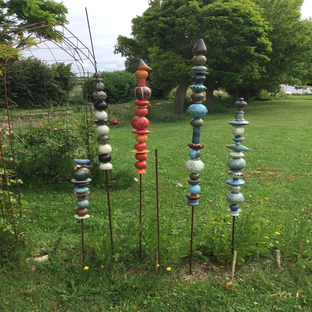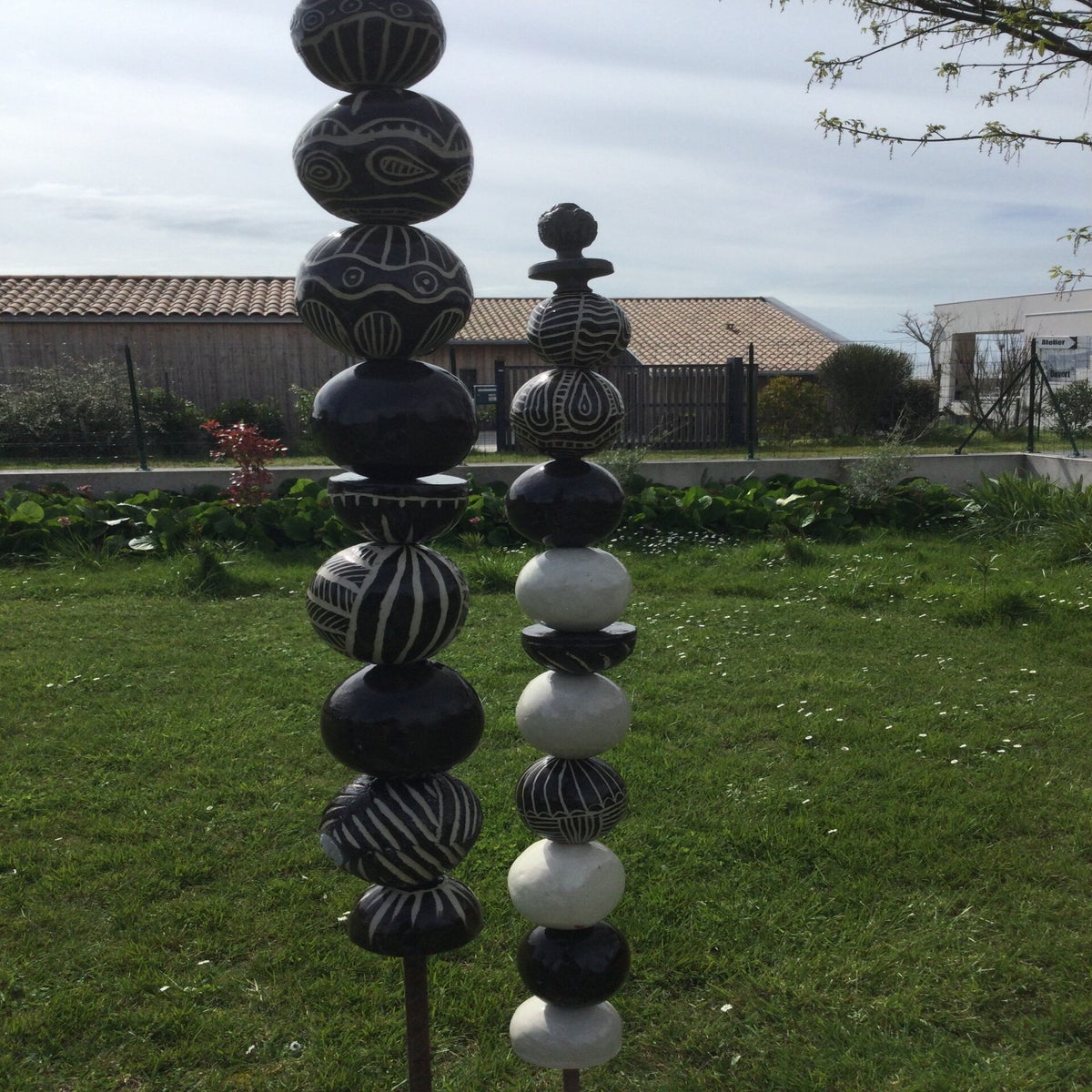 Ils sont constitués des boules ou autres créations en grès décorées et émaillées. Elles se glissent sur une tige métallique qui se positionne dans un jardin ou une cour au milieu des buissons et des fleurs.