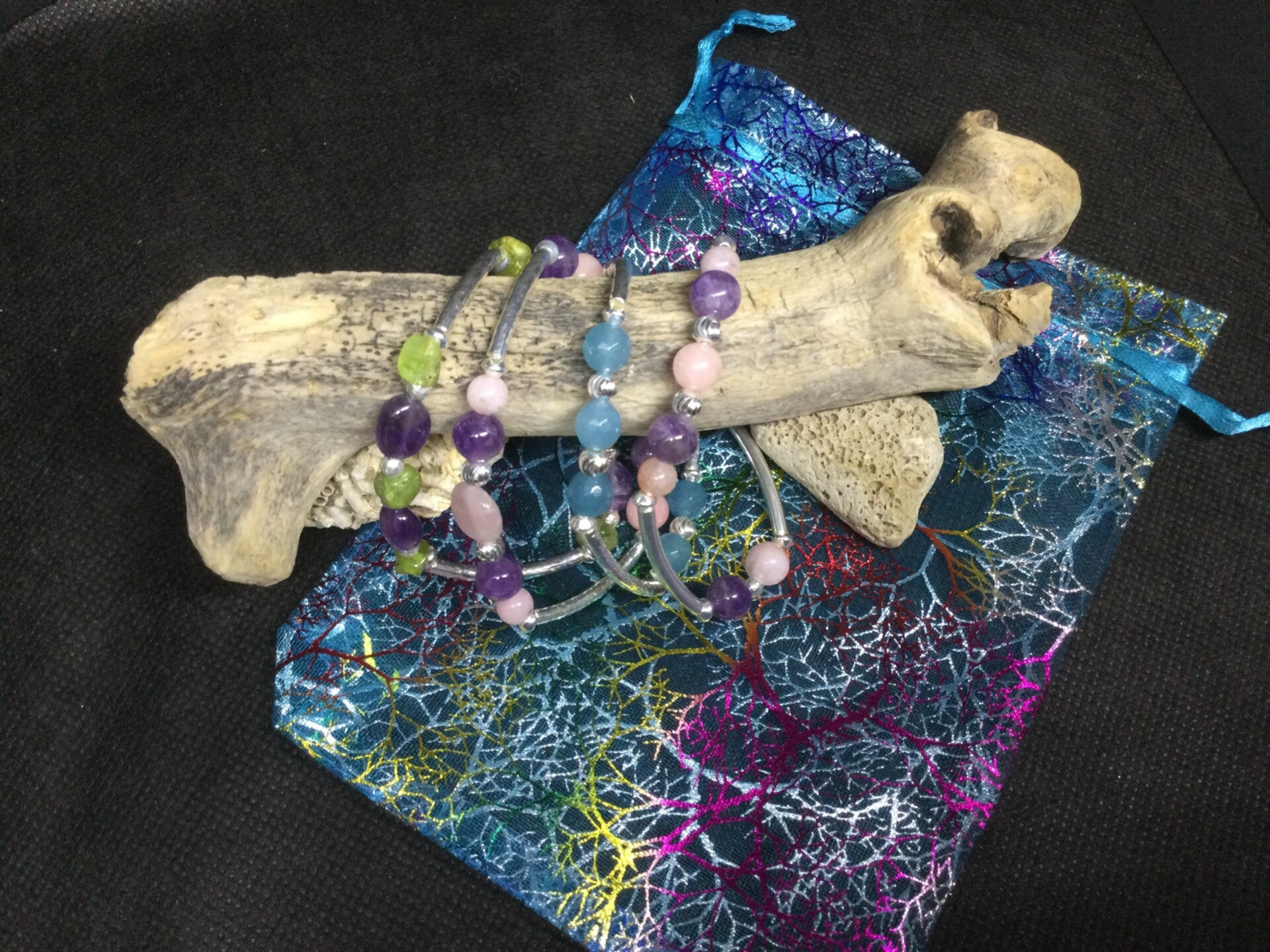 Contraste du violet de l'améthyste avec le rose de l'opale. Alternance de tubes lisses et de perles d'argent striées. L'améthyste égaye la transparence du quartz rose rehaussée par l'opale d'un rose plus soutenu.