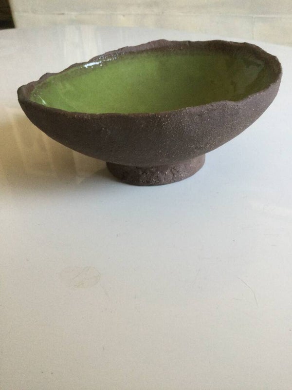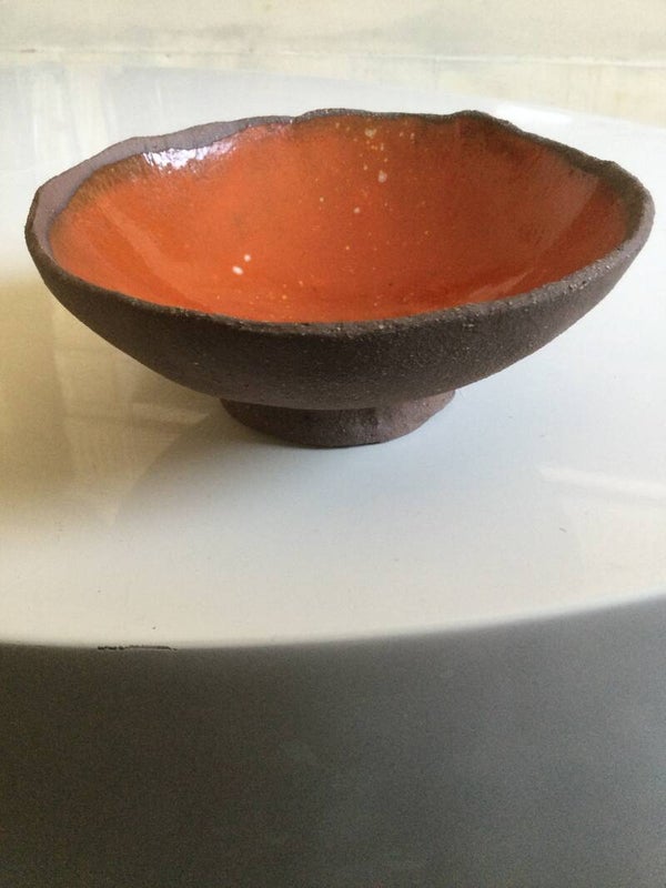 Créé en terre très rugueuse foncée, ce bol nous apporte une sensation proche du minéral. Il est illuminé par un émail très lisse et très coloré qui forme un beau contraste avec le bord foncé. Un petit pied lui apporte de l'élégance.