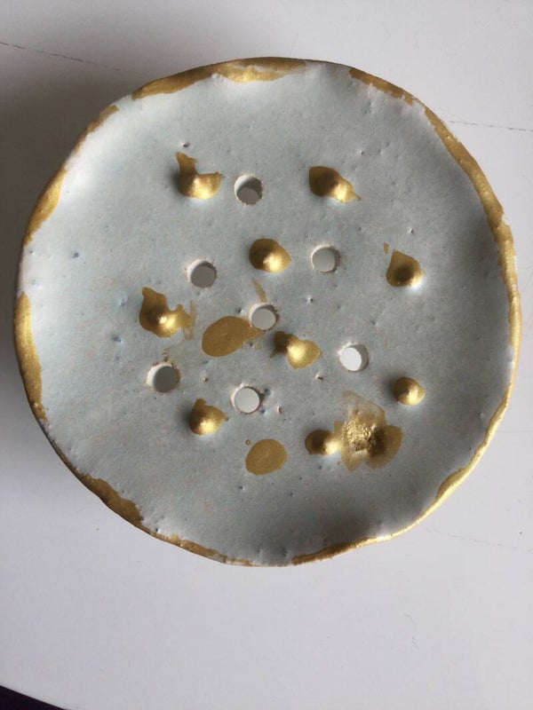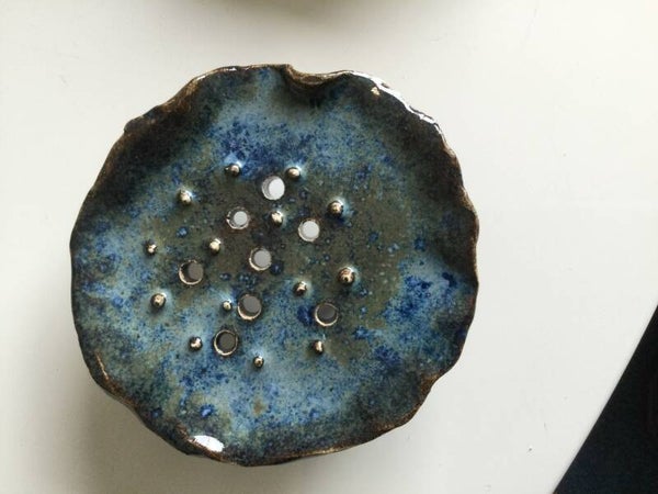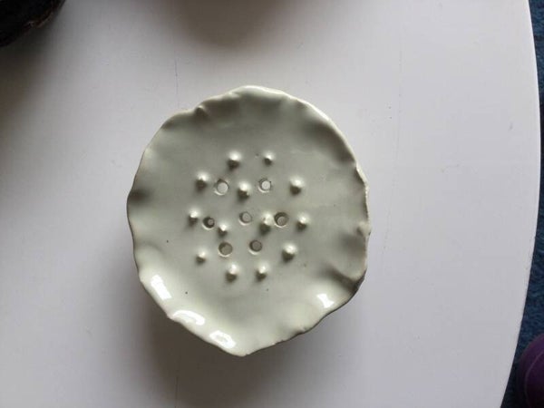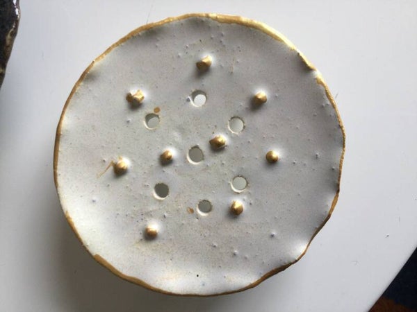 Ornée de petits picots pointus et percé de trous ce petit porte-savon fait le bonheur de l'utilisateur de savons ronds. La coupelle est rehaussée par trois petits pieds qui lui apportent hauteur et élégance. Les picots pointus permettent au savon de sécher rapidement.